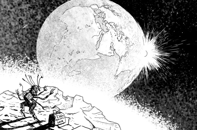 I illustrated some of the poetry I’ve written over the years mostly for my own visualisation of the characters. The Flea Cycle is an illustrated work that brings together poems first written and performed in Peterborough c. 2006/7, about an intergalactic mechanical flea that arrives on Earth to try to save the planet from its own destruction. I added to the original body of six pieces; including playing with ChatGTP to translate some of my poems into binary code and to generate part of a response from the intergalactic council, to one of Flea’s transmissions. I then reworked all the 2006/7 pencil sketches into black and white digital graphic art.